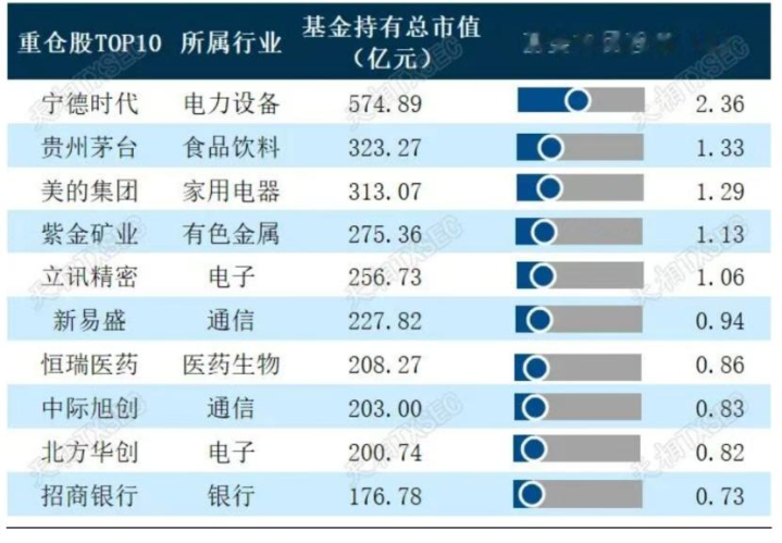 个股方面,从天相投顾统计的公募基金抱团程度来看,宁德时代的比例仍旧最高,为2.36%,贵州茅台位列第二,比例为1.33%。